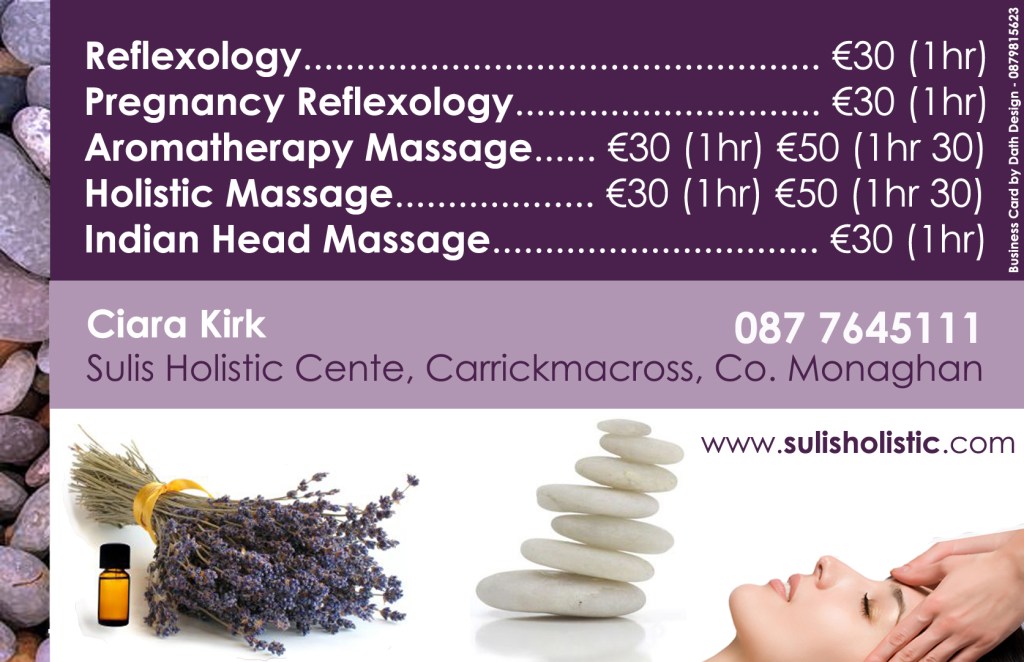 (Above) Business Card Front & Back designed by David Patrick Marron for Sulis Holistic